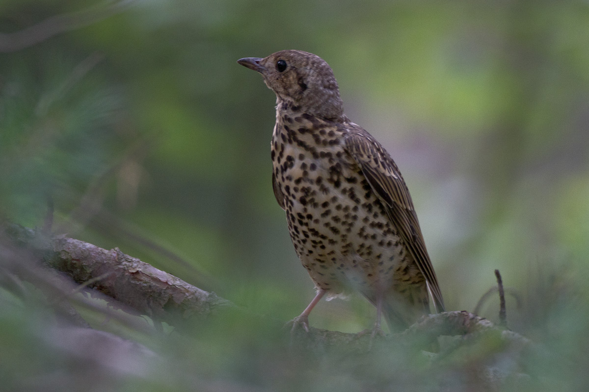 Nakkefjerene er 'uldne' dvs. af dårlig kvalitet (mangler bistråler), og er også plettede, som er et typisk træk hos unge drosler. Du kan lige ane de små vingedækfjers lyse skaftstriber, noget som ligeledes kun ses i denne dragt.
