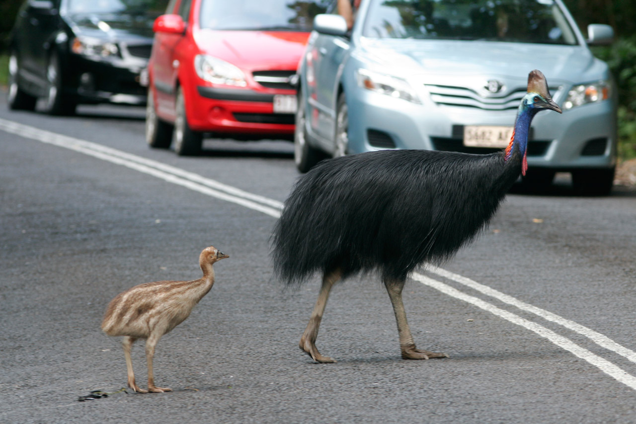 Beskrivelse: Cassowary is a much respected Australian bird and as a result of increased traffic killings, roads through areas of protected rainforrest are often subject to heavy speed reducing facilities and information signs.
