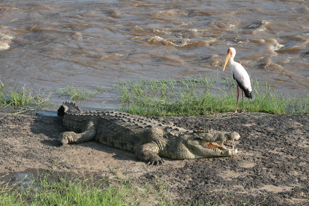 Beskrivelse: Mens krokodillen venter på at gnu- og zebra-crossing starter er der tilsyneladende ingen fare for storken