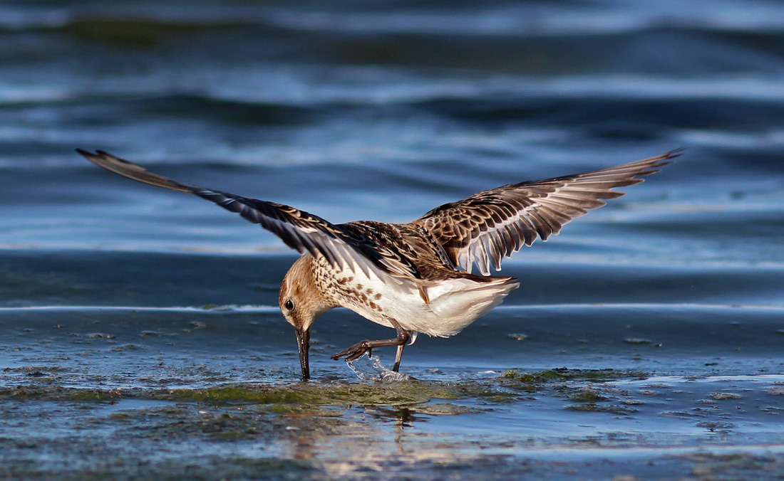 Beskrivelse: Ca 10 Alm. Ryle havde specialiseret sig i at steppe på overfladen. mens de fiskede røde myggelarver op af vandet.