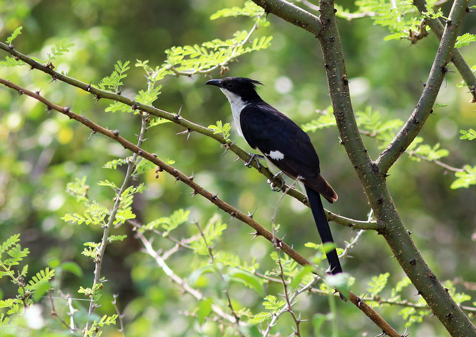 Rigtig dejligt billede. Race-stemmelsen af Jakobiner-gøge er vist mest noget med mål og så noget subtilt med fine streger på struben/brystet eller ej. Hvad afgør racebestemmelsen af fuglen på dette billede? Ssp. pica yngler ganske rigtigt i Kenya i månederne marts-oktober, men ssp. serratus fra det sydlige Afrika er samtidig 'vintergæst', idet den udenfor egen yngletid trækker mod nord. De to racer gentager i øvrigt tricket i omvendte roller, idet ssp. pica er 'vinter'-gæst i det sydlige Afrika, når ssp. serrator har yngletid i månederne oktober-april. Gøgene på vinterophold bruger bl.a. tiden på fældning og er diskrete - modsat ynglefuglene. Så den umiddelbart flotte dragt og synligheden taler for en korrekt bestemmelse. Hvis de ikke de brunlige håndsvingsfjer antyder noget om gamle fjer, der står foran fældning?