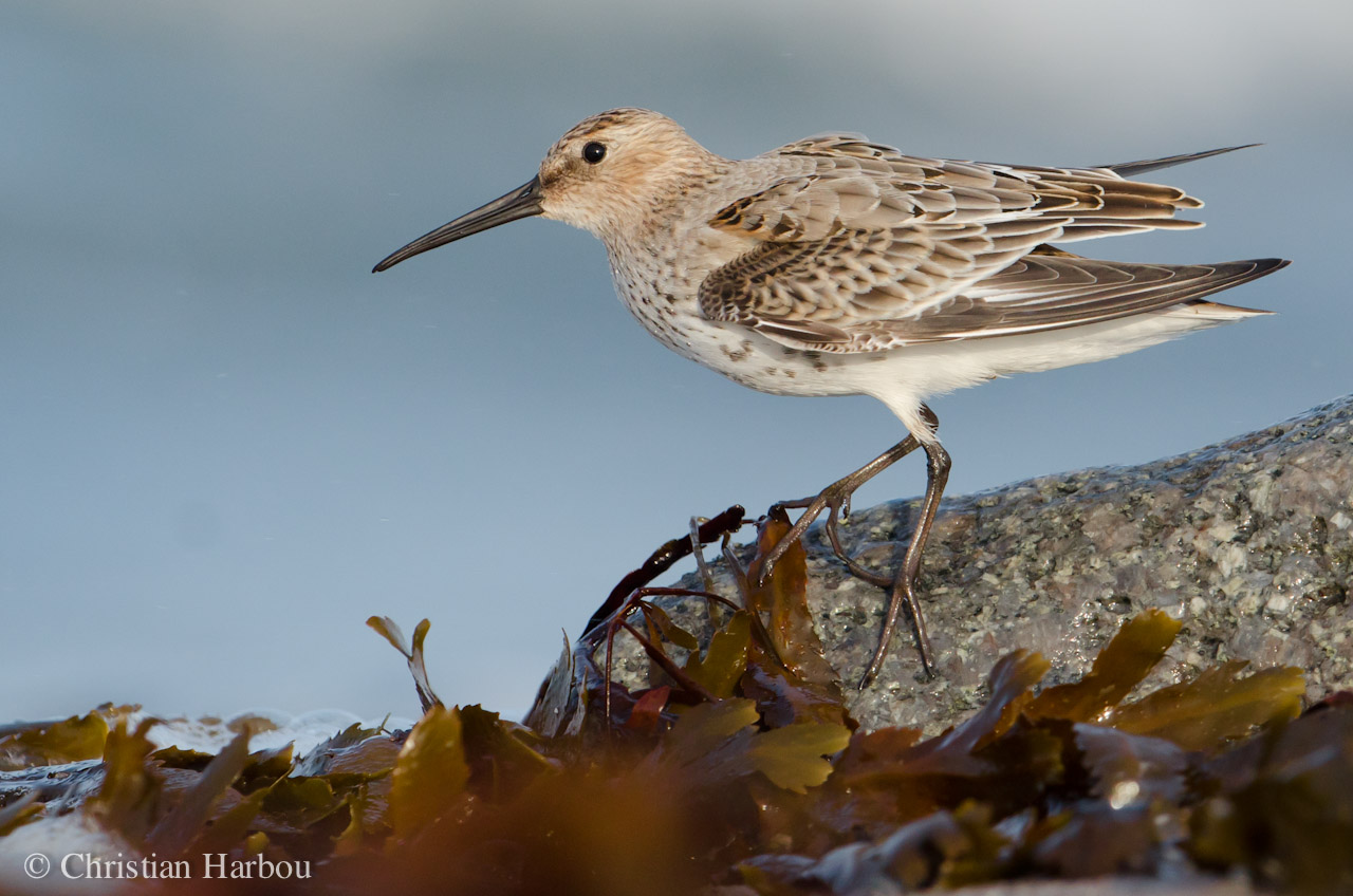Beskrivelse: Fronten af den tropiske orkan, Katia, gav allerede mandag ret kraftig vind ude på revet. Rylerne måtte holde næbbet lige i vinden og holde godt fast i sten og tang for at stå fast. Skummet fløj vandret og fuglene fik små vandperler på fjerene. Men de veg ikke pladsen, for pludselig var bølgekanten mere interessant end den gamle tang, længere henne ad stranden. Friske forsyninger af alt godt fra havet. Det er i øvrigt utroligt som alm. ryle kan se ud på mange forskellige måder.