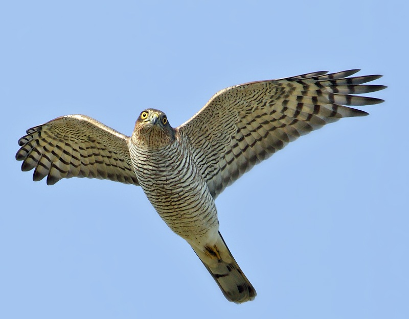 evident er det, at fuglen her er Spurvehøg (som jeg også skriver ovenfor). Og jeg er helt enig med dig i fremstillingen af kendetegn for Duehøg (dog må jeg ærligt erkende, at jeg fejlagtigt troede undersidetegningen hos adult VAR mere grålig hvad båndene angår).