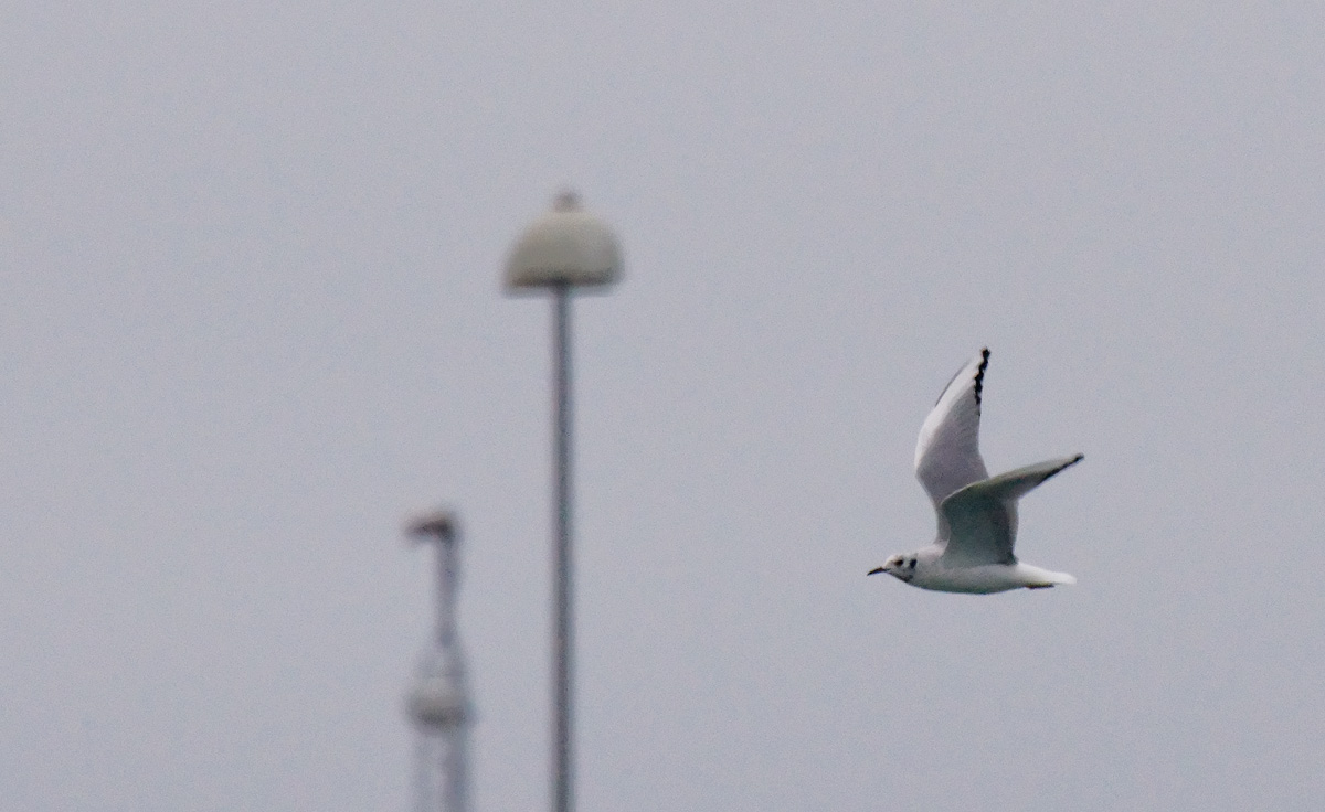Beskrivelse: Fundet af Lars Pedersen, LP. Fløj meget rundt især omkring bassinerne omkring havnevagten, hvor dette billede er taget. En svær fugl at opdage, men de lyse undervinger er nok det bedste kendetegn. Herudover ses selvfølgelig også det tynde sorte næb. Ca. samme størrelse som Hættemåge, i hvert fald ikke nogen størrelsesforskel af betydning, som man lægger mærke til i felten.