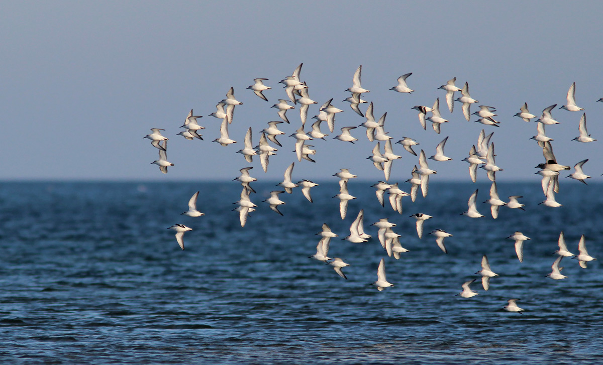 Synes at flokbilleder er mega fede da man kan sidde og sammenligne forskellige arter der står lige ved siden af hinanden eller flyver i flok, så man kan af prøve de forskellige kendetegn, her f.eks med Strandhjejlen som er en markant større art i forhold til rylerne og med sin sorte armhul og nærmest sølv grundfarve:)