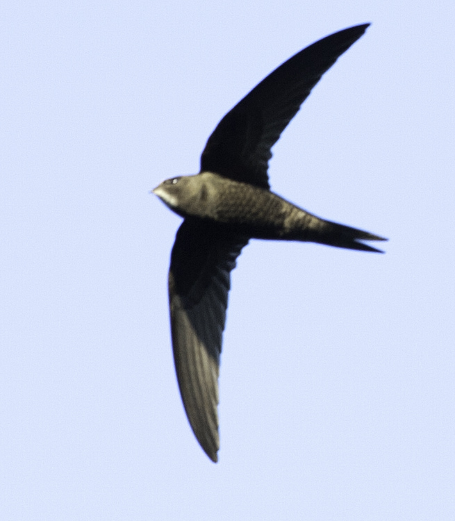 Stor hvit strupeflekk, lysere armsvingfjær og selvfølgelig skjellete buk.
