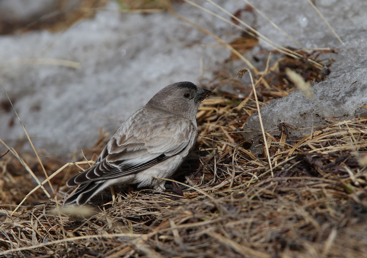 Beskrivelse: Brandt’s Mountain Finch, som givetvis indtil videre må lide den tort at hedde ID: xxxxx, har et fint engelsk/latinsk artsnavn efter en Brandt som sikkert ikke er fra Esbjerg men fra en anden tid og et andet geografisk sted... BMF er en art som krydrer den besøgende europæiske ornitologs fantasti inden afrejse; for naturligvis er ikke mange bekendte med de centralasiatiske bjergfugle. Brandt’s Mountain Finch (Black-headed Mountain Finch) Leucosticte brandti er sammen med Plain Mountain Finch (tidl. Hodgson’s Mountain or Rosy Finch) nogle af de fugle som året rundt giver liv i landskaberne i de karske råkolde Tien Shan bjerge (Himmelbjergene) langs Kirgisistans grænse ind til Kina. Der er ikke mange fugle over trægrænsen, og især ikke om vinteren og i det tidlige forår, men når man støder på bjergfinkerne er det altid interessant. Om sommeren og i de store vinterflokke på flere hundrede individer er BMF temmelig sky – medmindre man uforvarende kommer til at komme reden for nær; så popper de op på den nærmeste sten, og sidder roligt og nedstirrer Klodshans med sine klare sorte øjne. Om vinteren – sidst oplevet for ganske få uger siden, oplevedes flere flokke af BMF der rastløst og ængsteligt flagrede rundt langs de åbne græsarealer i det ellers snedækkede landskab. Umiddelbart ingen prædatorer – fare på færde, eller hur… Måske skyggen af en storfalk i horisonten tolder bestanden nu og da. Hvorfor ellers så forskrækkede? 22. april er sagen ganske anderledes. Det er forår; endnu koldt 3.200 m.o.h. De Hvidkronede Rødstjerter eller Güldenstädt’s Redstart som jeg foretrækker at kalde dem… er også på plads i landskabet. Faktisk årstiden hvor man kan opleve den ellers så sky rødstjert for fuld skrue. Hannerne har travlt med at hævde territorierne og ignorerer fuldstændigt nysgerrige ornitologer. GR gør sig også til for hunnerne – desværre blev billederne ikke Netfugl-skarpe da en han GR med himmelfaldent åbent næb, udslåede vinger og oppustet korpus krukkede sig foran en cerutfarvet hun. BMF er på plads i yngleområderne og parrene er allerede dannet, i hvert fald gav denne aprilmorgen gode nærobs af flere par BMF. Dels er vinteren på vej mod syd, foråret i buldrende anmarch og fedtdepoterne skal fyldes op med de tidligt spirende planter og andet æde bart – også de små seje sorte insekter som jeg ikke kender navnene på, men nogle edderkopper er i hvert fald at iagttage – måske de andre er SNELOPPER eller noget tilsvarende sjovt klingende. BMF æder mest planter/frø, men på denne årstid tror jeg de æder mangt & meget. Når de fouragerer blandt de åbne snefrie pletter er de i hvert fald ikke sky… Faktisk ganske tillidsfulde. Sætter man sig stille ned på den sjappede jord kommer de ganske nær og pusler rundt mens de vender og drejer stængler, småsten og roder i mulden som små Vildsvin. Det er en årstid man længes efter – især når termometeret viser minus en-og-tyve grader dags dato, og der endnu er måneder til foråret – men… det er på vej! Sammen med Jomfrutranerne (der allerede er samlet nede ved Issyk Kul søen 22.april), Hærfuglene, tornskaderne, etc. Alt det som findes i drejebogen for ornitologernes årscyklus. Foråret ER på vej!
