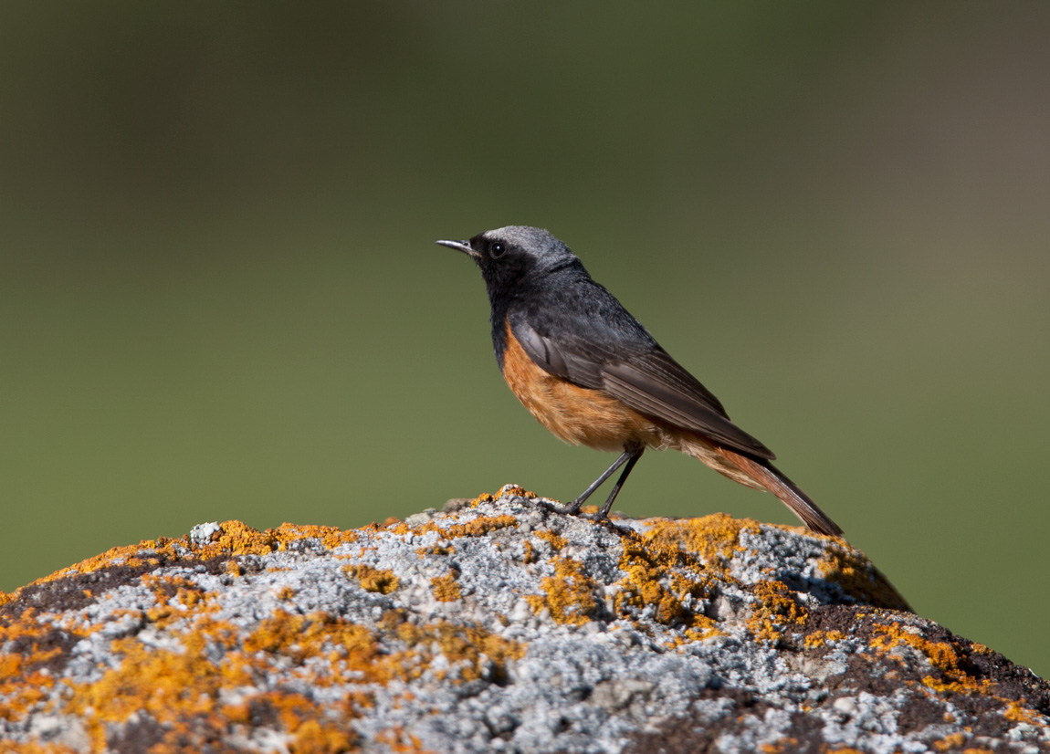 Beskrivelse: Så enkelt og smukt, kan en Husrødstjert han ssp phoenicuroides tage sig ud en juli eftermiddag i det centralasiatiske på en typisk biotop; en stor mosbesat stenblok blandt enkeltstående gamle Tien-Shan nåletræer. Parret yngler et sted blandt klippeblokkene og holder varsomt øje med forbipasserende. Stedet har været stensikker yngleplads de sidste fem år, men arten er relativt almindelig i omegnen. Barskaun er navnet på en nærliggende landsby, og dalen/slugten har samme navn. De omkringliggende bjergsider tårner sig op i 4000 meters højde, og som prikker ses Himalayagribbe, nogle-gange Munkegribbe og Kongeørne højt til vejrs. Hvis man gider, kan man stræbe sig opad og en halv dag senere sidde med rovtøjet om ørerne - men så er der jo langt ned til slugten som også huser godbidder.