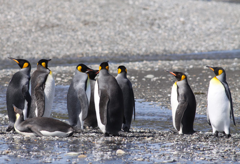 Beskrivelse: En helt ny ornitologisk attraktion er den flok af Kongepingviner, der for nyligt har etableret sig i bunden af den lange fjord mellem Porvenir og grænsebyerne San Sebastian. Ca. 100 km fra Porvenir går en vej mod højre til Onaisin. Efter et par km. ser man et stort hvidt kuppeltelt og en skurvogn, og dét er det nyoprettede besøgscenter, Penguino Rey, hvor man modtages af en vagt, der siden guider én ud til pingvinflokken formedent 12.000 pesos (= ca.120 kroner). Centret åbnede i oktober 2011. Ialt er talt op til over 90 kongepingviner her - og iår var der for første gang tale om ynglen, da en hun "stod på æg" (den er ikke med her og uploades ikke,da der jo er tale om et redefoto:)