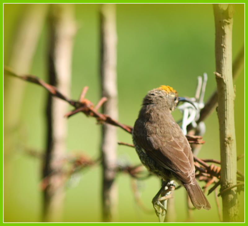 Mit gæt på ID er en tog Amethyst Sunbird pga. den jævnt overside, let vaterede underside og lys øjenbryn bag øjet. Men jeg er ingen ekspert i solfugle såå..... Måske ung Marico.