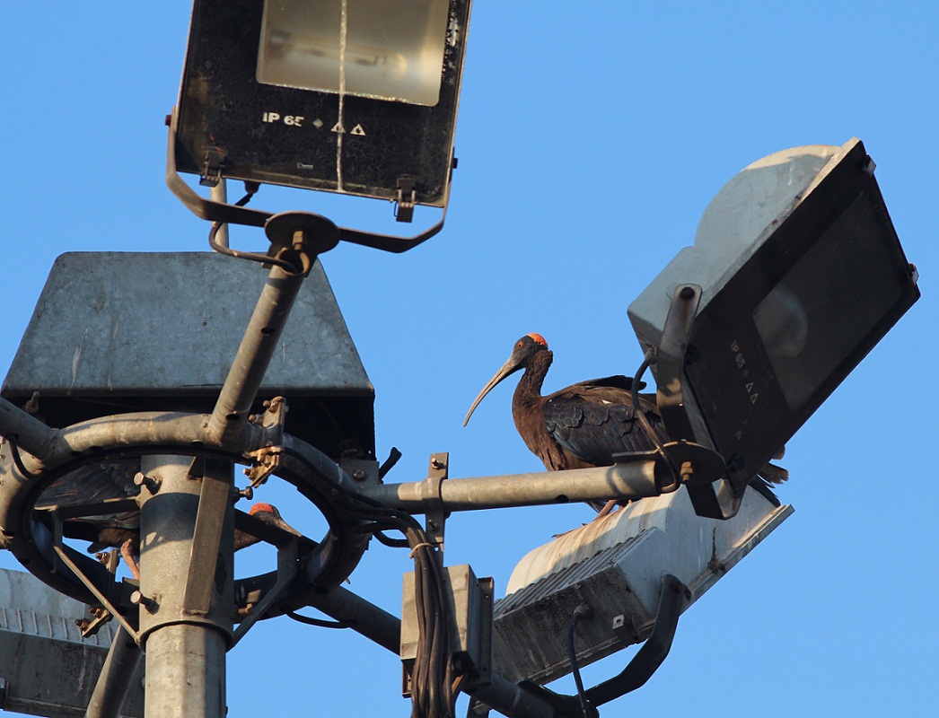 Beskrivelse: Man behøver ikke at spilde sin tid, mens man venter ved Ahmedabad lufthavn. Der er en hel del arter, der flyver rundt foran selve terminal bygningen bl.a. denne Red-naped Ibis.
