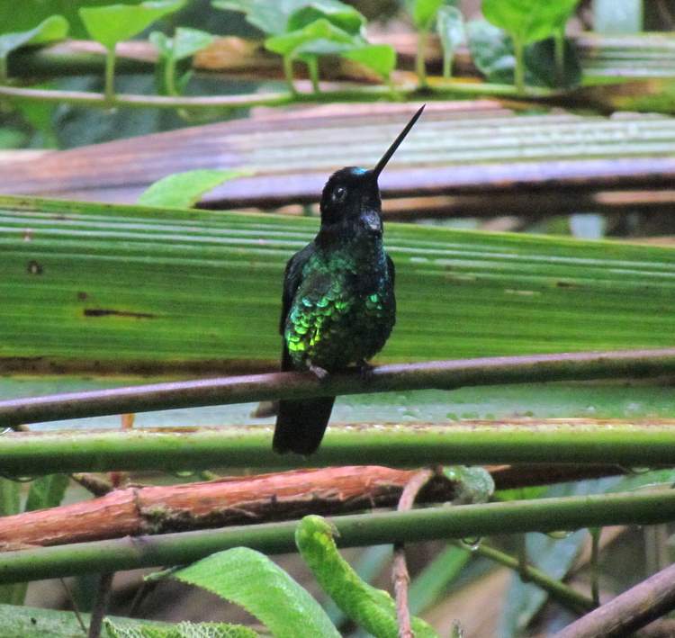 Beskrivelse: Hannerne virkede til at være mere hyper-aktive end hunnerne, og brugte mere tid på at jage rundt med hinanden, så det var lidt vanskeligt at få et godt billede af dem, men man kan vist godt fornemme, at det er en pææn kolibri.