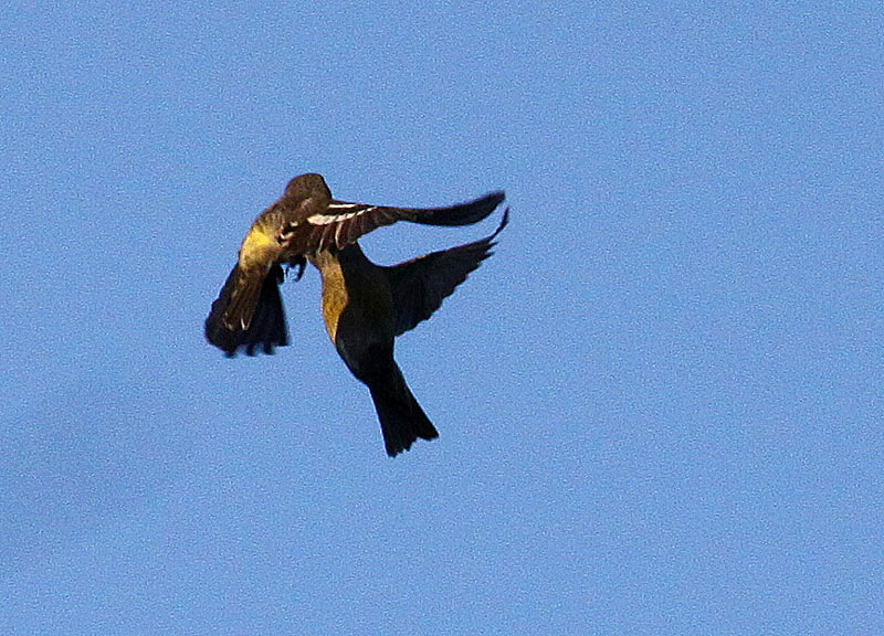 Beskrivelse: De meget tydelige vingebånd samt brede hvide pletter på tertiærerne ses her på dette actionfoto, hvor man måske også fornæmmer den lidt længere hale end Lille Korsnæb.