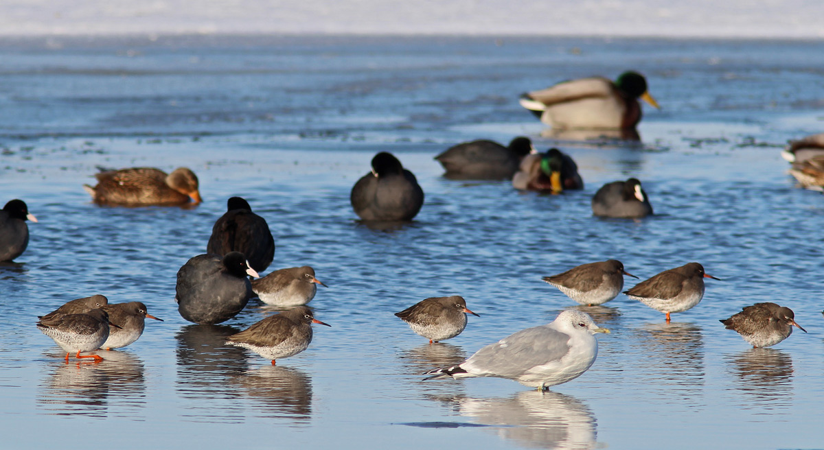 Beskrivelse: Der er stadig lidt åben vand ved Nibe, efter den sidste uges hårde frost har lukket Limfjorden. Her havde bla. denne lille flok af Islandske Rødben slået sig ned.