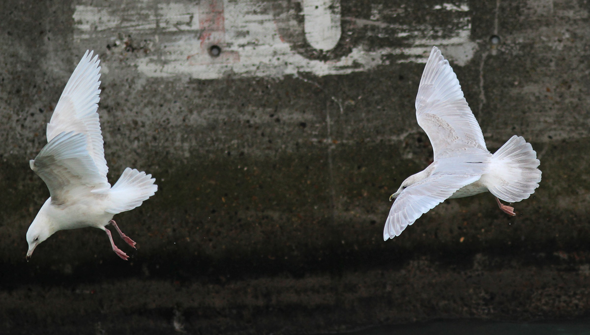 Beskrivelse: Og ja jeg er nok klar over at der i forvejen er mange billeder af Hvidvinget Måge i Galleriet. Men der mangler et flugtbillede af to Kumliens Måge 3 cy. med så stor forskel på dragten som disse to fugle.
