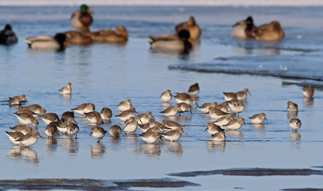 Beskrivelse: Der er stadig lidt åben vand ved Nibe, efter den sidste uges hårde frost har lukket Limfjorden. Her havde bla. denne lille flok af Almindelig Ryle slået sig ned, og der arbejdes ihærdigt med at finde føde.