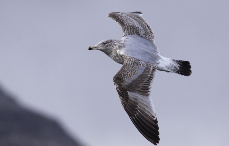 Beskrivelse: En af de karakteristiske, brogede immature Sølvmpger fra Nordatlanten. dette individ var større end de Sølvmåger, den fløj rundt sammen med, og havde fladere pande samt kraftigere næb, formentligt en han.
