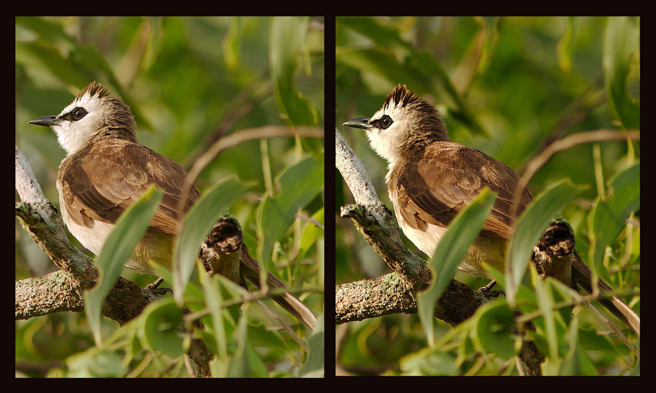 Solveig har fat i noget. Arten på billedet er en Hvidbrynet Bulbul - Pycnonotus goiavier (efter fransk goyavier, guavetræ) - Yellow-vented Bulbul. Levantbulbul er noget ganske andet.