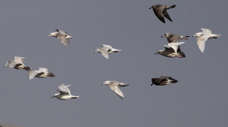 Beskrivelse: En flok, der er det rene guf for mågefreaks; meget mørke unge sølvmåger af formen argenteus i blandflok med en flok Hvidvingede måger, der her overvejende består af "kumlieni", = Hvidvinget måge med vekslende mørke tegninger i vingespidsen. nærstudier af fotoet vil vise den store individuelle variation hos "kumlieni", den synes at udgøre en meget varierende overgangsform mellem Hvidvinget måge og Thayers Måge.