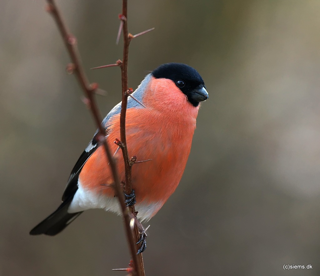 Beskrivelse: Dompapperne i min have er heldigvis standfugle. Hannen pynter i enhver busk :-)