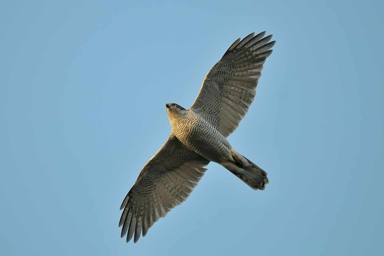 De indre armsvingfjer er helt ustribede. Det er tilsyneladende ikke en individuel karakter, men ses på alle flugtbilleder (fra undersiden) af adulte duehøge her i galleriet. Adulte spurvehøge har tydelige mørke tværstriber på alle armsvingfjer. Mon ikke det er en brugbar karakter til at skelne mellem de to arter?