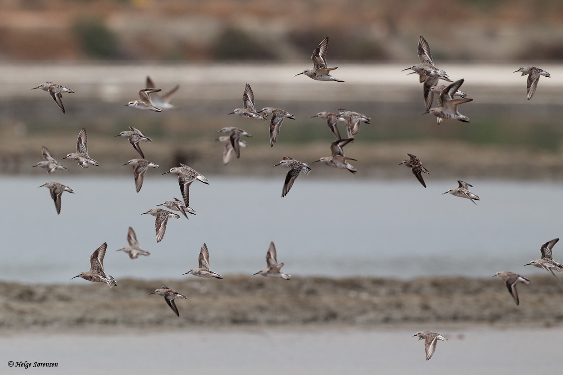 Beskrivelse: Langtået Ryle fremstår markant mørkere i flugten end de andre små vadere den omgås (her: Kærløbere, krumnæbbet ryle og rødhalset ryle)