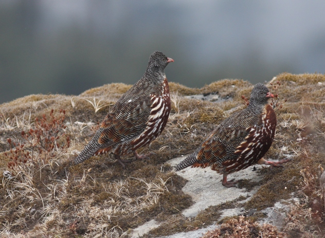 Beskrivelse: Snow Partridges lever højt i Himalaya over trægrænsen på græs- og buskklædte skråninger, og er utroligt godt camouflerede i forhold til omgivelserne. Den skal især findes på kaldet. Oppe i SeLa passet i 4170 meters højde oven for Dirang lykkedes det efter længere tids eftersøgning Eric Schaumburg at lokalisere en flok på syv, og senere viste det sig, at der var ikke mindre end tre flokke i området, ialt 15 fugle. De var ret tillidsfulde, vi kunne gå tæt på dem, mens hannen stod og holdt vagt over flokken på en klippeblok.