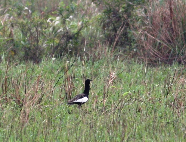 Beskrivelse: Kaziranga Nationalparken i Assam, i græslandet ved Bramaputras bredder, er en af de sidste gode lokaliteter for den truede Bengal Florican. Den ses fra watchtoweret tidlig morgen (husk skop!) ved indgangen til Kaziranga Centrale del (hvor elefantrideturene starter). Når man først er oppe på elefanten skal man ikke regne med at se den, for det gynger alt for meget til at se på fugle i kikkert. Vi fandt desuden denne han i den vestlige del, og var heldige at se den lave det berømte display, hvor den flyver op i luften i en bue, med oppustet, sammentrukket hals, dinglende ben, og med udstrakte vinger i glideflugt.