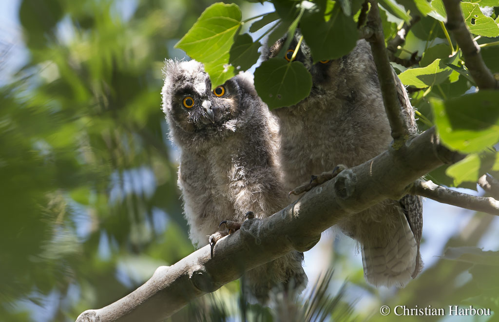 Beskrivelse: Den ene af ugleungerne er tydeligvis nogle dage ældre end lillesøster (eller -bror) ved siden af, at dømme efter halens længde.