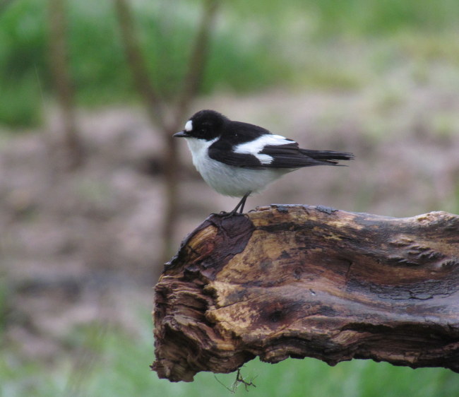 Beskrivelse: Stor hvid pandeplet, helt sort hale uden hvide yderhalefjer og stor hvid plet ved basis af håndsvingfjerene adskiller arten fra Broget Fluesnapper.
