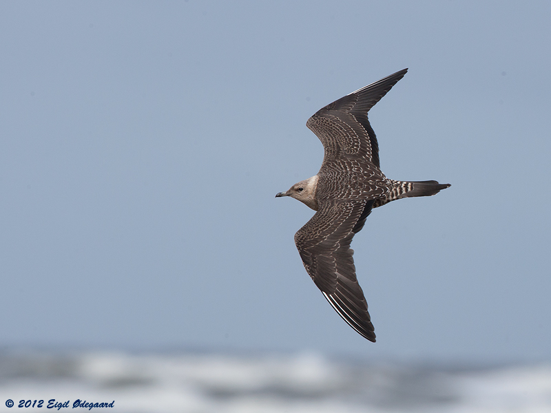 Beskrivelse: Som een af de få kom denne smukke unge Kjove på tæt hold på denne blæsende sensommerdag til forskel fra adskillige andre havfugle i horisonten.