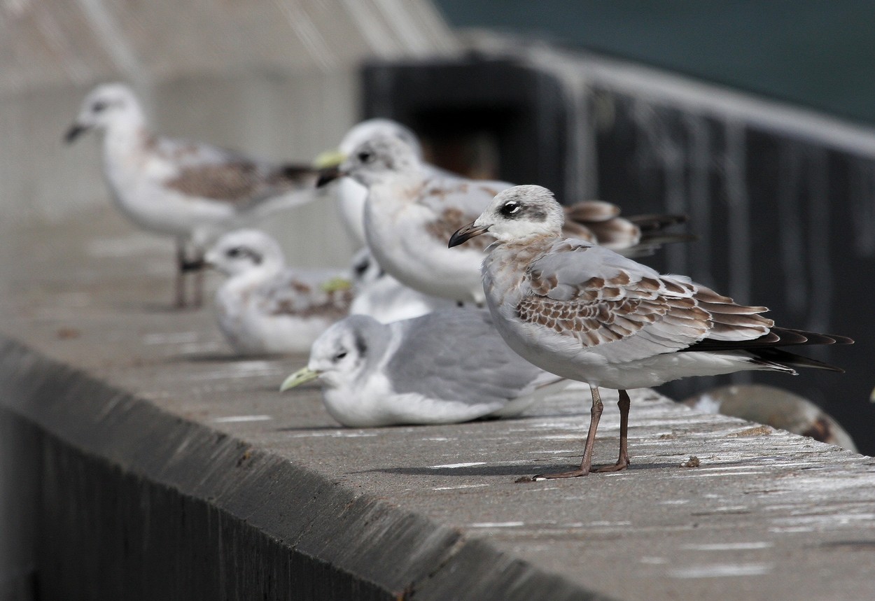 Beskrivelse: 4 af dagens 11 unge Sorthovedede Måger i Hanstholm Havn.