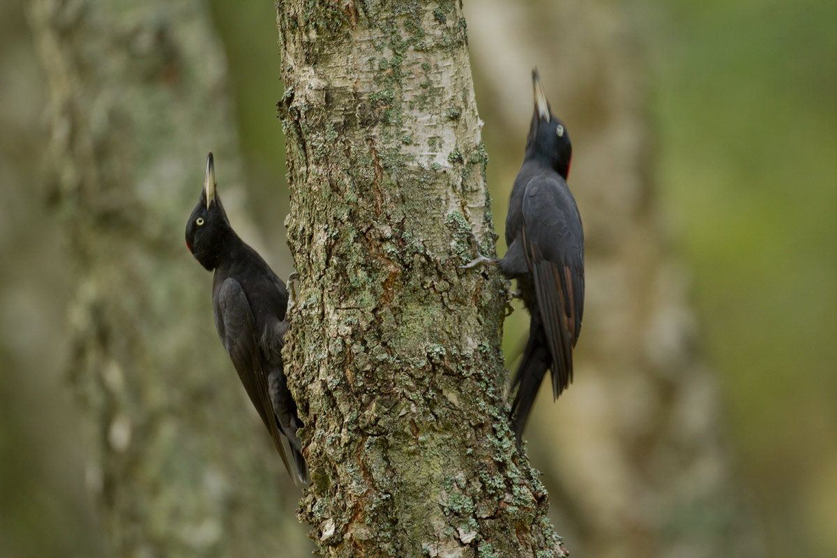Beskrivelse: De to hunner var ikke bedste venner. De prøvede fra hver sin side af stammen at skræmme den anden væk. Både ved at hoppe op og ned af stammen og vise hvor store de var, ved at brede vingerne ud i fuld længde.