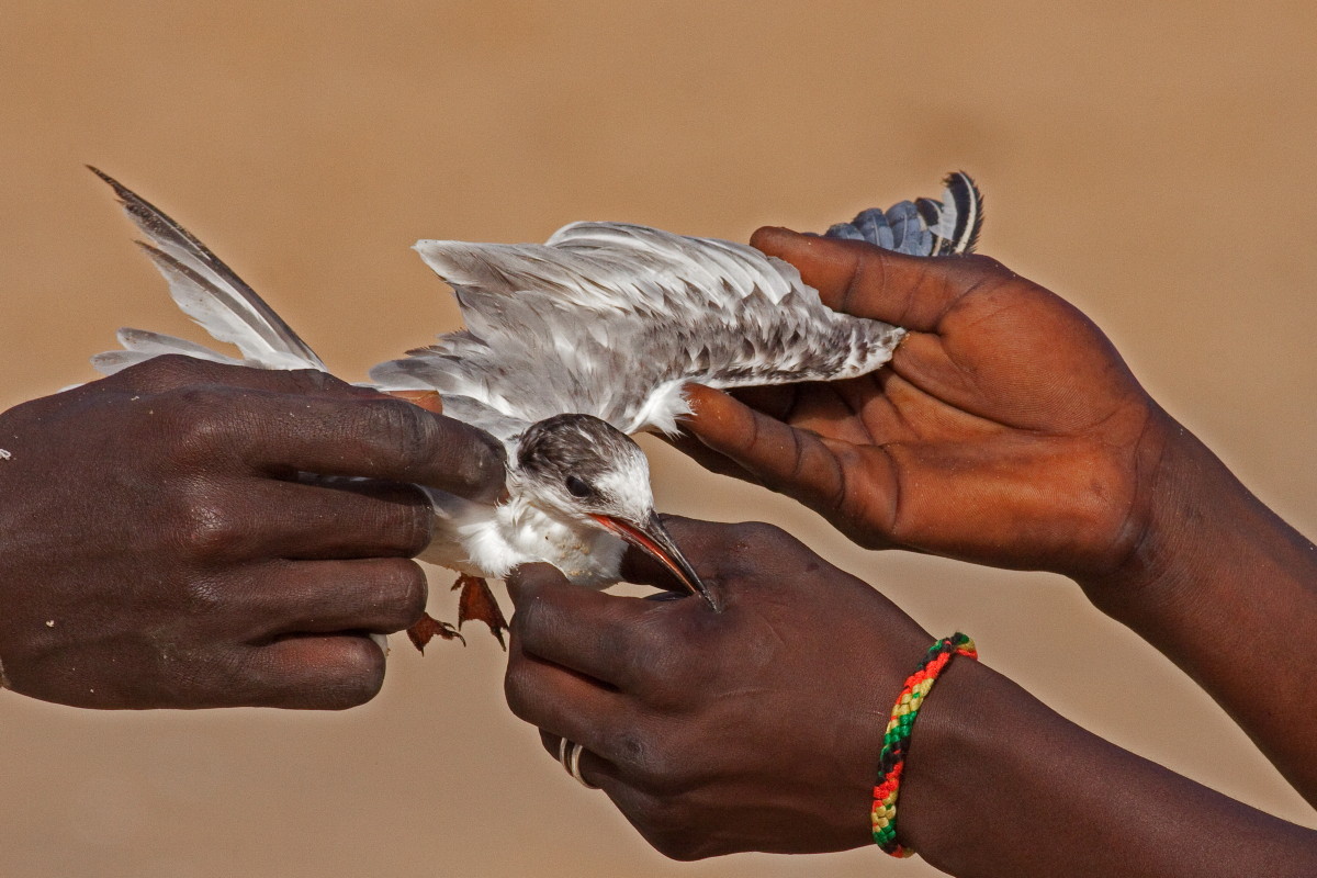 Beskrivelse: Lokale fiskere undersøger denne forstyrrede, juvenile fjordterne.