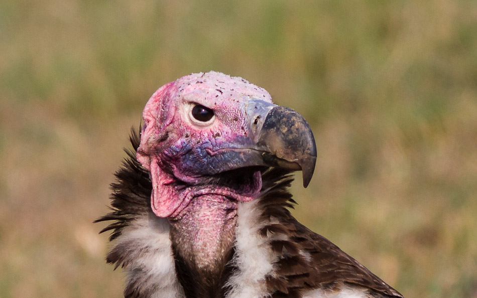 Beskrivelse: Øregribben har det graftigste næb blandt gribbene og kan åbne skinnet på ådsler, som ingen anden grib kan få hul på.