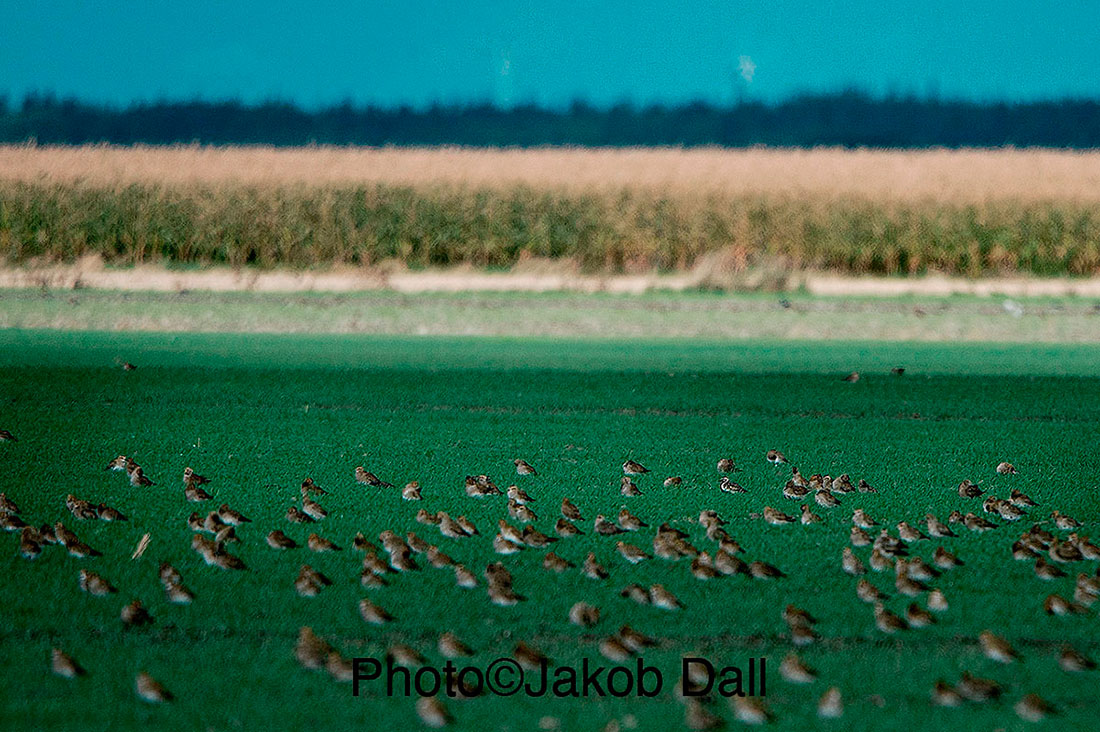 Jeg går ud fra, at det er den adulte fugl i baggrunden til højre der er tale om. Den synes at have meget hvidt på en ellers tilsyneladende ufældet sommerdragtsflanke, hvorfor jeg tænker, at det måske ikke er en Sibirisk Hjejle?