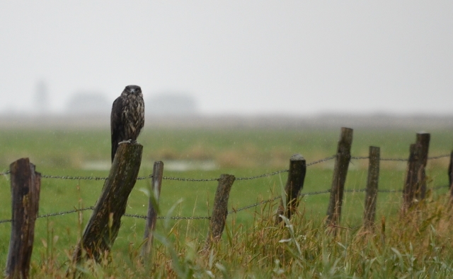 Beskrivelse: Ung Jagtfalk med en grå silhouet af Tipperhuset i baggrunden.
