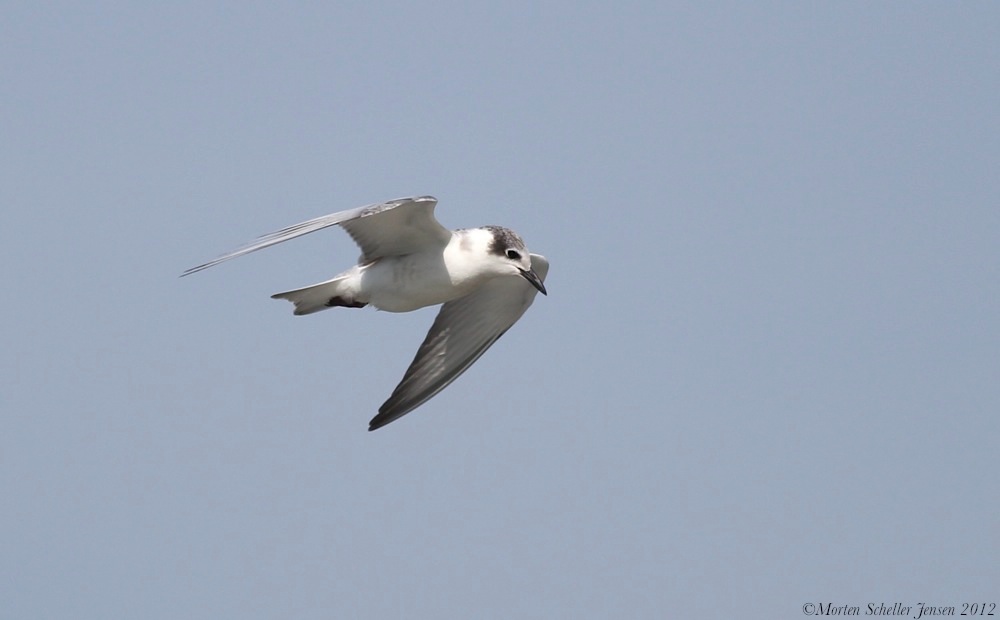 Denne fugl er afgjort ikke en Sandterne, men derimod en Hvidskægget Terne. Gad vide, om tegningerne på kropssiden er rester af adultdragten, da jeg ikke mindes at have set dette på unge Hvidskæggede Terner?