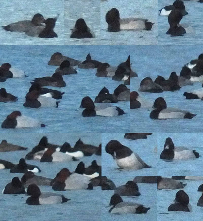 Beskrivelse: Collage, hvorpå fuglen optræder 11 gange. I samme flok som Lille Bjergand, som jeg først troede det var - MEN næbspids med for meget og bredt sort, og med lyst bånd inden for a la Troldand lidt i retning af Taffeland. Ryggen næsten jævnt mørkegrå og ikke så mørk på bagerste skulderfjer som Lille Bjergand. Hoved sort med under nogle lysforhold let både brunligt og blåligt skær.