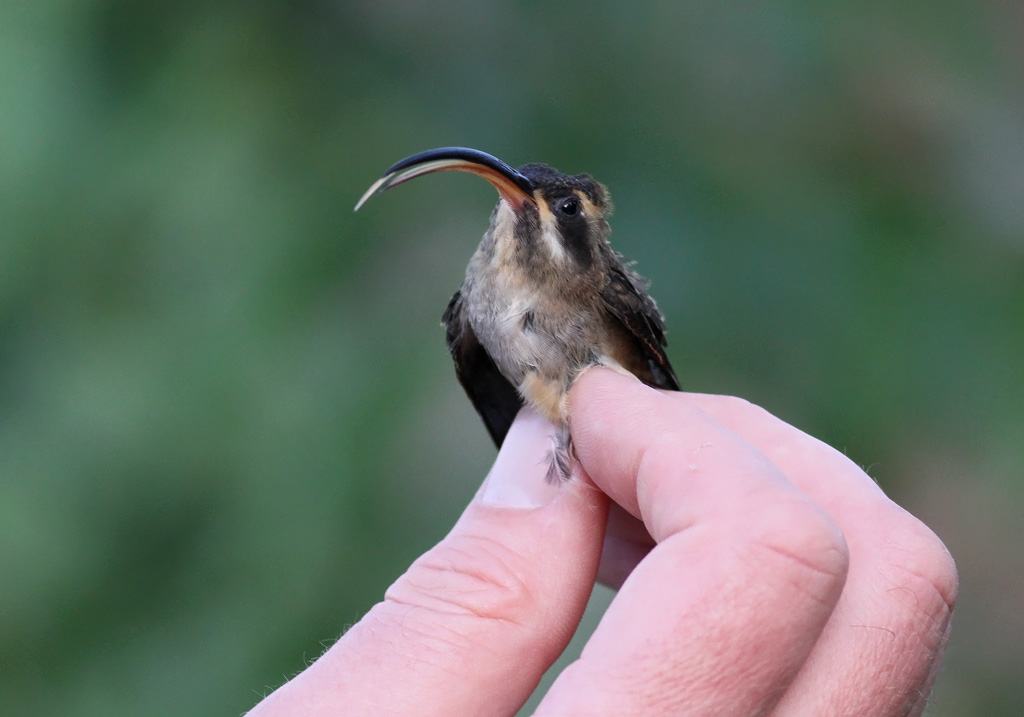 Beskrivelse: Fuglen var stødt ind i et eller andet og faldet til jorden. En hjælpende hånd kom til, og fuglen kom på vingerne igen.