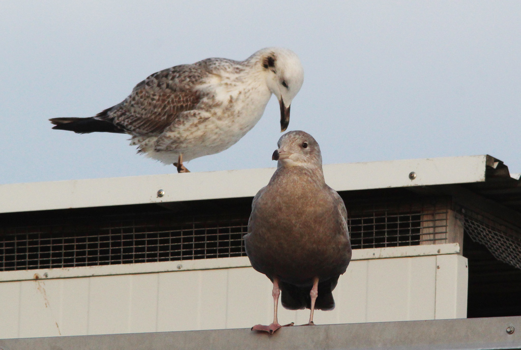 Jeg tror du har billede af omtalte kombination til gode. Jeg er ikke enig i at bagerste fugl er en Kaspisk Måge. Jeg tror snarere det er en Svartbag...