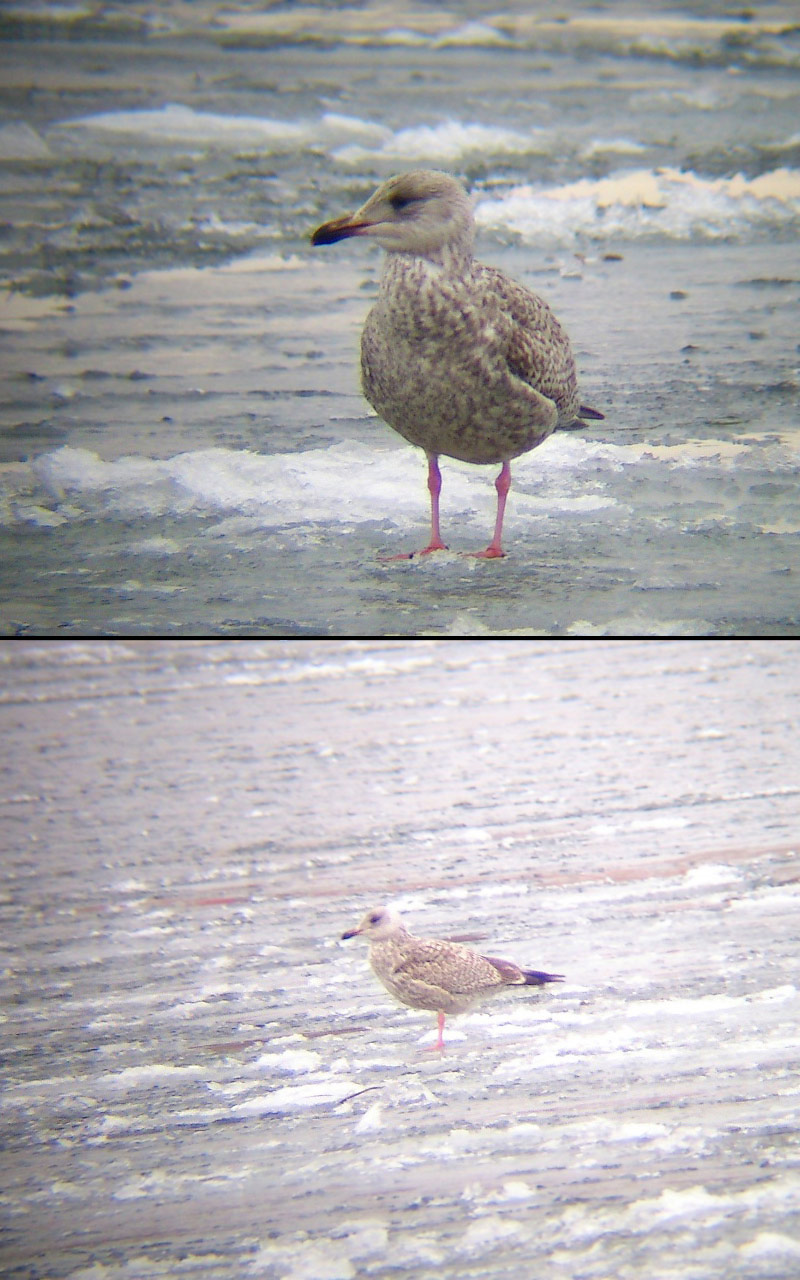Beskrivelse: Fik øje på fuglen med det samme p.g.a. de usædvanligt mørkrosa ben og den lidt mærkelige næbfarve/-tegning. Fuglen havde i flugten nærmest michaelis tegnet overgump/hale med skarpt afsat halebånd og næsten hvid hale/overgump samt et usædvanligt stort lyst felt i de inderste håndsvingfjer, større end jeg husker at have set på en sølvmåge.