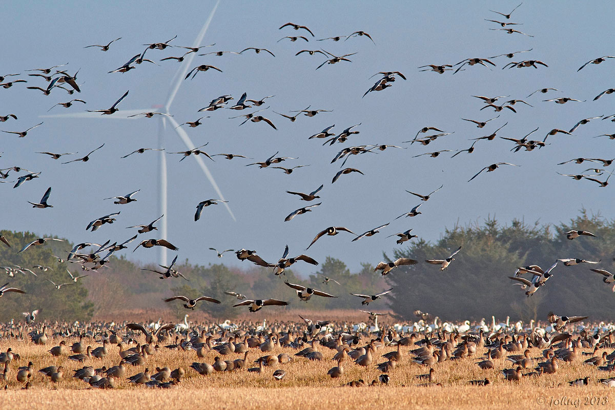 Beskrivelse: Større rastende flok bestående af bramgæs, kortnæbbede gæs, blisgæs, sangsvaner, som har befundet sig på Pallisbjerg Enge i et stykke tid. Se DOF-basen.