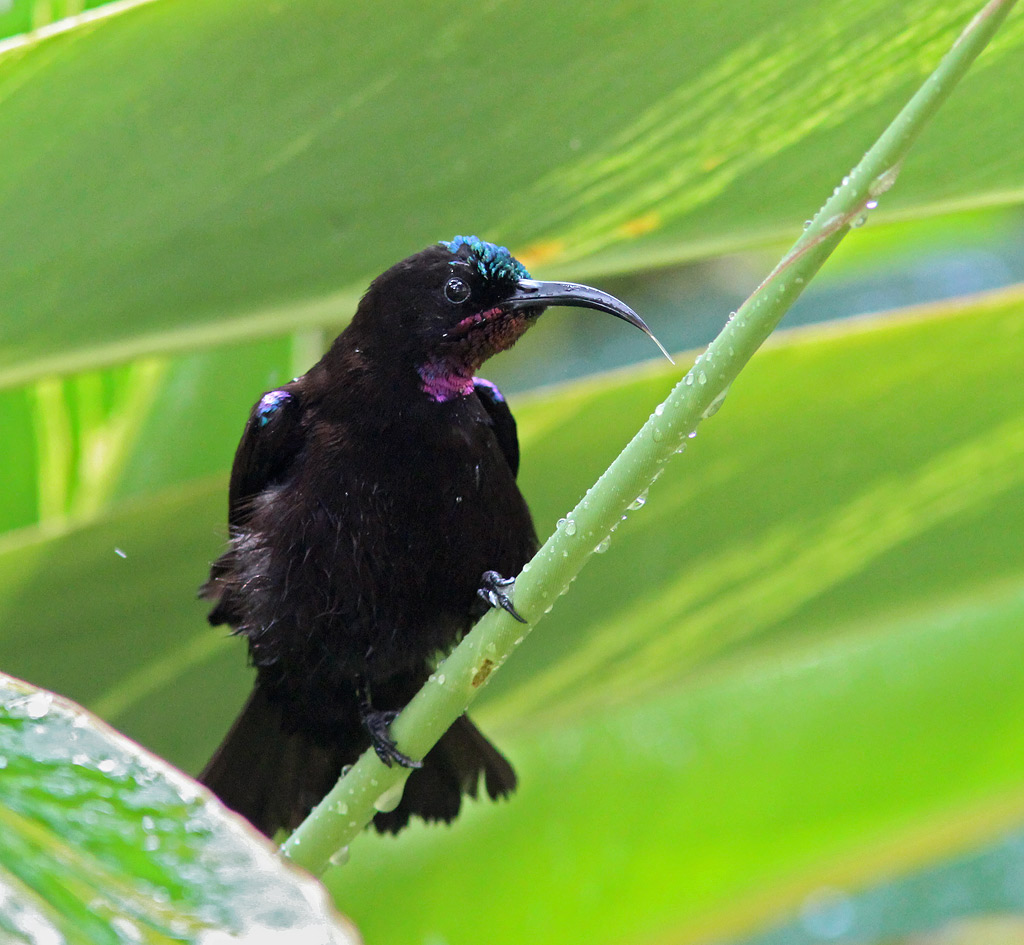 Beskrivelse: Denne Ametystsolfugl udnytter at der vandes i haven på vores Guesthouse i Nairobi. Med tungen sidder den og slikker vandet af plantestænglen.