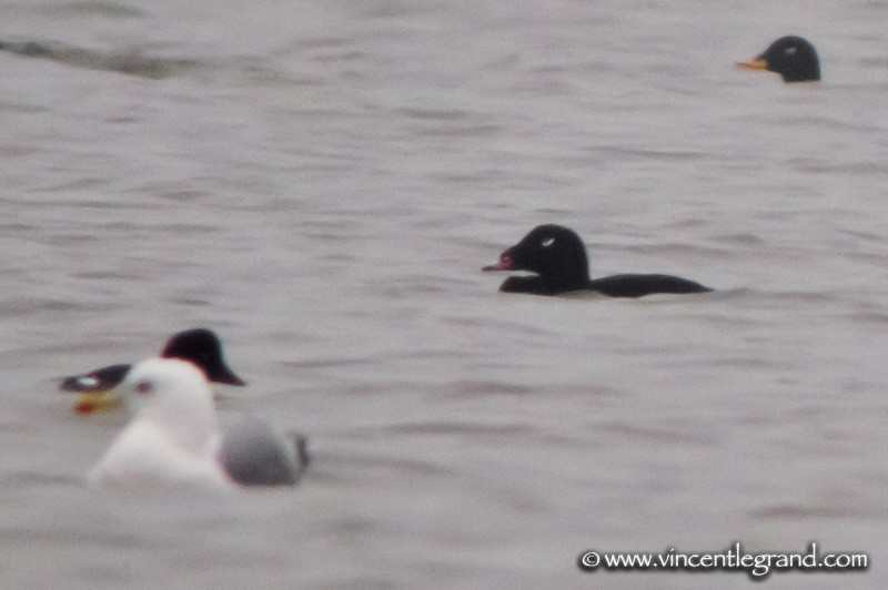 Beskrivelse: 1867,3 km to tick this Mega from Brussels. This drake was at around 150m far from the beach among a mixed group of Velvet & Common Scoter and Common Eider. Here on this picture we can easly see how head shape are different between Velvet and White-winged Scoter. More than jiiz, this drake displaying with a female Common Scoter...
