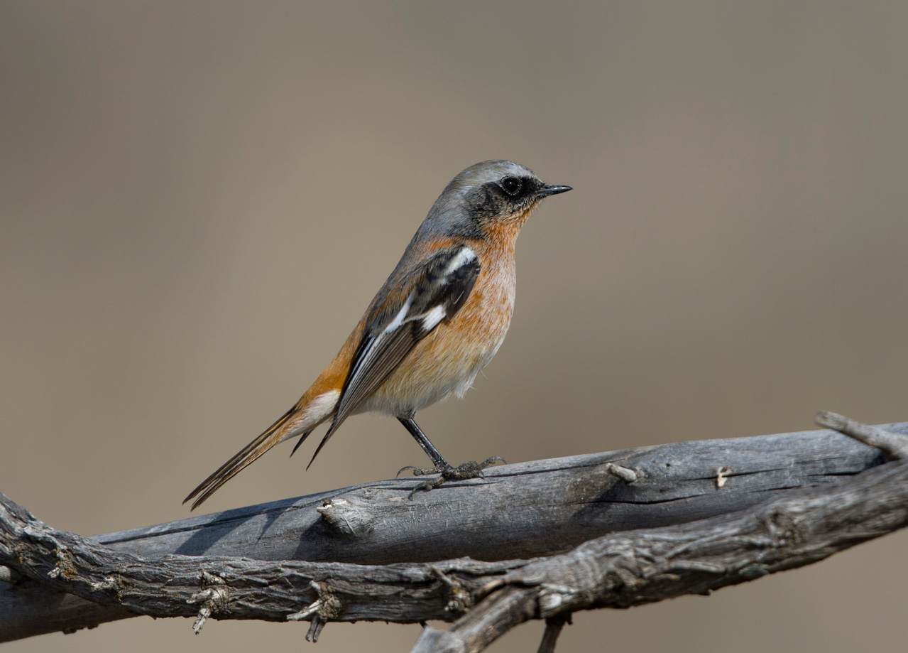 Beskrivelse: Gråhovedet Rødstjert eller som foreslået til navnegruppens revision af undertegnede: Eversmann's Rødstjert - en tilbavenden til artens tidligere danske navn. Rødstjerterne hører sammen med de øvrige drosler til mine favoritter.Familien rummer smukke udgaver, og er altid en udfordring i felten. Ikke så meget af ID-mæssige årsager men fordi rødstjerterne kan være utroligt sky; proportionalt med deres skønhed. Eversmann's Rødstjert har fulgt mig i mange år her i Centralasien - eller rettere JEG har forfulgt dem i mange år. Af drilske årsager har Eversmann's været en af de sværeste overhovedet, og var en af de sidste arter der manglede til mit arkiv (der mangler stadig grumt mange). Jeg ser dem hver sommer oppe i bjergene, kender biotopen men har alligevel aldrig formået at få et interessant billede af arten. Om sommeren yngler den fra 1500 m.o.h. og opefter til skovgrænsen. Den er ikke udpræget skovfugl, men holder gerne til langs bevoksningsgrænser; hvor højstammet skov overgår til spredte grupper af buske og enkelte graner - altså i udkanten af skovene. Gentagne gange har jeg gået gennem sådanne biotoper, og haft en Eversmann's siddende et par sekunder frit eksponeret i toppen af en busk eller træ, hvorefter den hurtigt dykker ned i vegetationen og forsvinder. Den reagerer IKKE på play-back, og dens sang er enkel og man skal lytte godt efter for at bestemme den. Mange af mine kunder har gennem årene haft større held med at få billeder, men reglen er også at man skal gå med skudklart kamera, og det gør jeg sjældent (med mindre vi er ude i noget Sneleopard lusk). Den er svær nok at lokalisere, og på dens biotoper er der som regel andre gode sager at holde øje med (Sortstrubet jernspurv, White-winged Grosbeak, sangere, etc. Den overvintrer i lavere højde i dette barske bjergland. Gerne langs vandløb og i dette tilfælde langs Issyk-Kul søen i det østlige Kirgisistan som aldrig fryser til pga termiske kilder. Et af mine andre billeder viser en EVR som sidder ved et vandløb i vinterlandskab højt oppe i bjergene; så den er virkelig ikke kuldeskær... Som nævnt er den umådeligt sky, og det gælder også på dens vinterpladser. Jeg har ofte gået rundt i 6-8 timer og blot set den glimtvis. Den høres oftere end den iagttages, og den opretholder territorium på vinterpladserne, og de respektive tilstedeværende fugle har travlt med at få andre artsfæller ud af vagten når de mødes. Så hører man artens karakteristiske elektrisk-smaskende kontaktkald. Den 20.februar havde jeg netop tilbragt ti timer i felten, og overhovedet ikke været i nærheden af at få et pænt billede af arten, hvilket var et af formålene i de dage. Der var en vejret, og fra ultimo februar går det fremad med stormskridt mod det tilstundende forår. Det kan være koldt, men dage med mildning er hyppigere, og lige så snart det mærkes - har man en fællesnævner med fuglene der også er på tæerne... Evermann's Rødstjert får travlt med at bevæge sig opad mod ynglepladserne i bjergene. Denne dag var markerne også ryddet for de store lærkeflokke, så jeg havde godt luret at der var ved at ske noget. På vejen til mit overnatningssted går jeg langs en stribe træer, og pludselig hører jeg en Eversmann's typiske "elektriske" klad, og en han reagerer på min tilstedeværelse. Helt tydeligt er han irriteret eller rettere på tæerne. Han bevæger sig MOD mig, og ikke væk - det er helt tydeligt at hans instinkter og hormoner er i spil, og at han er skide forvirret og ikke selv aner hvorfor han er så hektisk. Han reagerer på samme måde mod en hund der løber forbi og selv en forbikørende lastvogn får hans opmærksomhed. Det er ret sjovt, for jeg har oplevet det før med bjergrødstjerterne... I april er dens fætter Güldenstädts Rødstjert også helt oppe på tangenterne oppe på deres yglepladser i bjergene. har oplevet hvorledes Güldenstädts hanner var så optagne af at hævde deres revirer mod andre hanner, at de fuldstændigt ignorog alle omkring dem. Har set denne ellers så sky art hoppe rundt få meter fra mig, mens den pirker i græsset og jager rundt med andre hanner. Sprøjst! Så Eversmann's hannen den 20.februar gav mig en ide om at der var ved at ske noget. Næste dag afsøgte jeg nye steder, og omkring frokosttid havde jeg lokaliseret 4 Eversmann's i en gruppe træer, som tydeligvis var optaget af pseudo-revir hævdelse, og de var på vej op i bjergene. Fik et par udemærkede billeder, og var ganske godt tilfreds. En gruppe kasakhstanske roere kom løbetrænende forbi og fik skræmt Engværlinger og Eversmanns ad Hekkenfeldt til. Istedet arbejdede jeg med andre fugle i området, og der var fuld aktivitet på alle fronter. I kikkerten får jeg øje på en Eversmann's der fouragerer i småbuske 200 m væk. Den koncentrer sit ophold til en række pæle og småbuske. Har tydeligvis travlt - flyver skiftevis op og sætter sig eksponeret på en pæl, og flyver på nærmest fluesnapper-maner ned på jorden - til og fra dens siddeplads. Uden større tiltro til foretagendet begiver jeg mig tættere på, og bemærker at den faktisk er travlt optaget. Får listet mig nærmere, og så forsvinder den... Ok - frokosttid... mad & the nydes i solskinnet og ganske veltilfreds noteres formiddagens fugle: White-browed Tit-warbler 8fine-fine obs...), en flok Engværlinger (vildt god - den er sjælden), fede obs af Azurmejser, Misteldrosler, Hvidkindet Værling, etc. etc. Pludselig sidder Eversmann's rødstjerten ti meter væk ved samme pælerække som jeg tidligere havde set den opholde sig ved. Det er åbentbart et godt sted. Tillige gider den blive fotografert, og jeg er nærmest Målløse-Mortensen hundrede+ billeder senere... En adult han i slidt vinterdragt, men med tydelig tegn på sommerdragtens snarlige fremkomst. den er PERFEKT, og jeg kunne ikke ønske mig bedre fugl. Den er nærmest for imponerende flot om sommeren..., og jeg har altid godt kun
