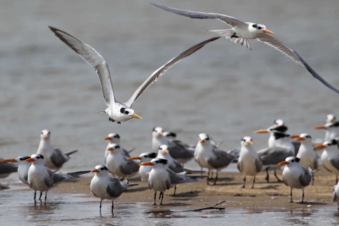Den flyvende fugl til venstre har dog et lidt mere gift-grønt næb end de andre. Men den har lys ryg og samme størrelse som de andre Bengalske terner på billedet. Jeg vil mener, at alle fuglene på billedet er Bengalske Terner.