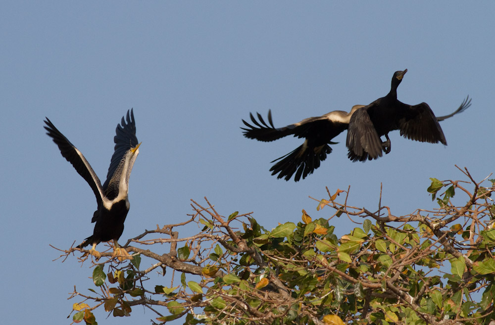 Ja selvfølgelig er fuglen forrest til højre en indisk skarv, som flyver op sammen med slangehalsfuglene.