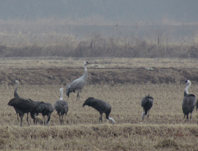 other than the ghostly palegrey colour, what was most striking first, was the larger size of the bird, which doesn't really show in this picture, as the bird is more distant, than the Hooded Cranes in fornt, but was comparable to a single Common Crane present.