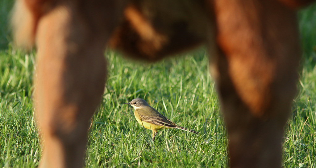 Beskrivelse: Et godt eksempel på at Gul Vipstjert ofte fouragerer mellem benene på kreaturerne.